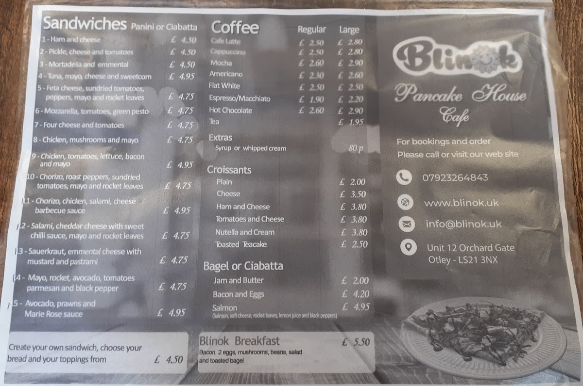 Introducing the menu at Mr Blinok Pancake House Cafe, a charming dining spot nestled in Otley, offers a delightful array of options sure to satisfy any craving. This cozy café, strategically located next to the bus station, features a vibrant selection of pancakes, from indulgent sweet variations like the Lotus Biscoff to savory choices such as the Caliente, packed with chicken and chorizo.